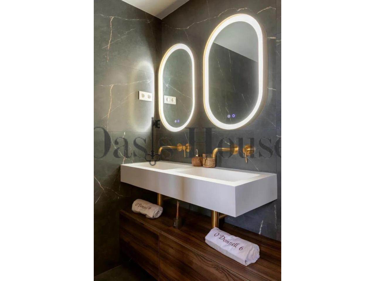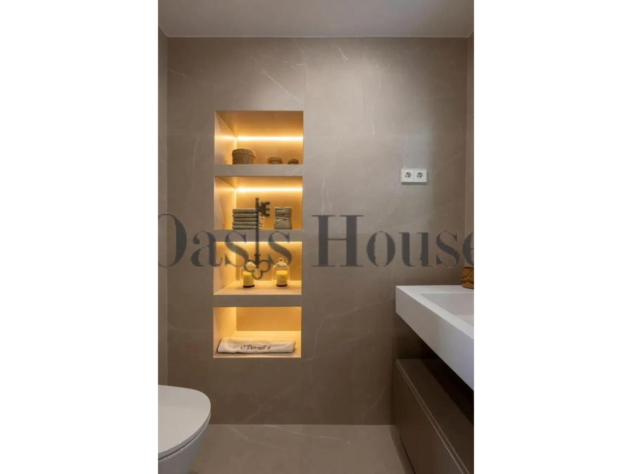 La propiedad dispone de tres dormitorios en suite, diseñados como auténticos espacios de descanso. El dormitorio principal disfruta de vistas directas al Parque del Retiro y cuenta con un amplio vestidor a medida. Uno de los dormitorios incorpora un sofisticado baño con bañera exenta y ducha de gran formato, creando una atmósfera de bienestar y confort contemporáneo. Un aseo de cortesía complementa la zona social.