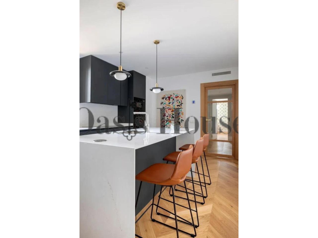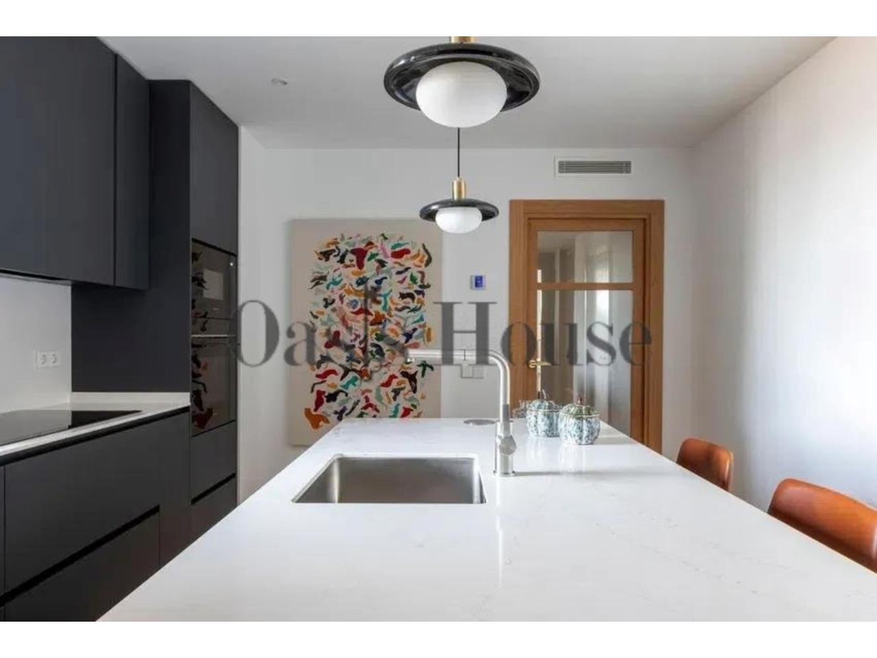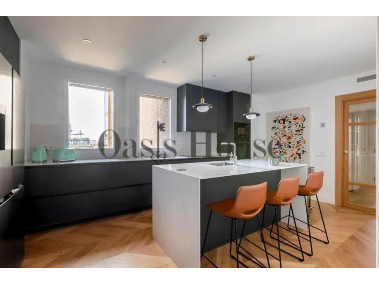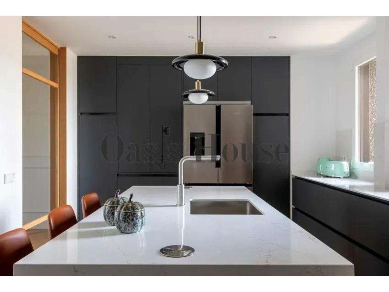 La cocina, independiente y bañada por luz natural gracias a sus dos grandes ventanales, se articula en torno a una elegante isla central. Está equipada con electrodomésticos Siemens, nevera americana y una funcional zona de lavandería independiente, integrando diseño, tecnología y practicidad.