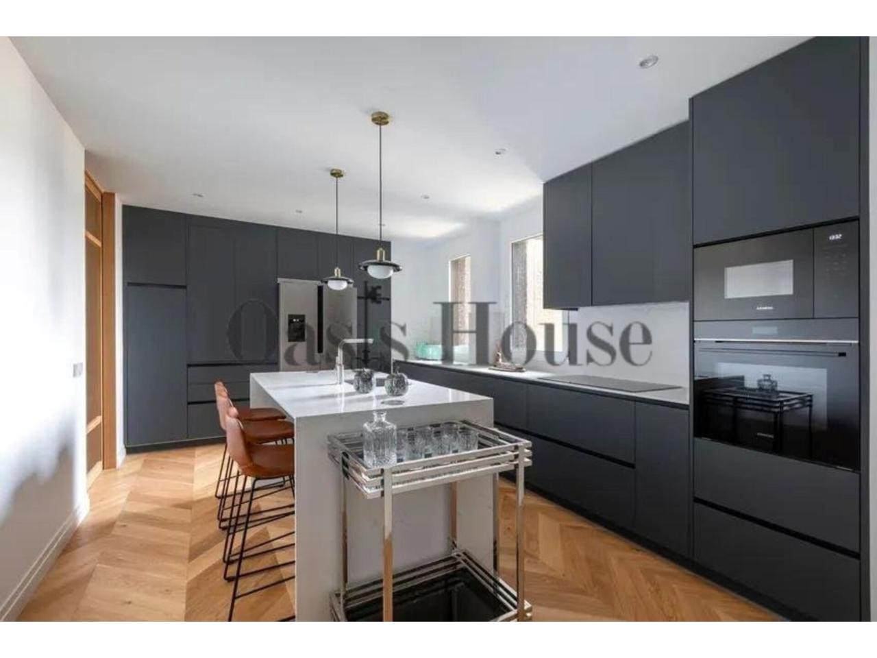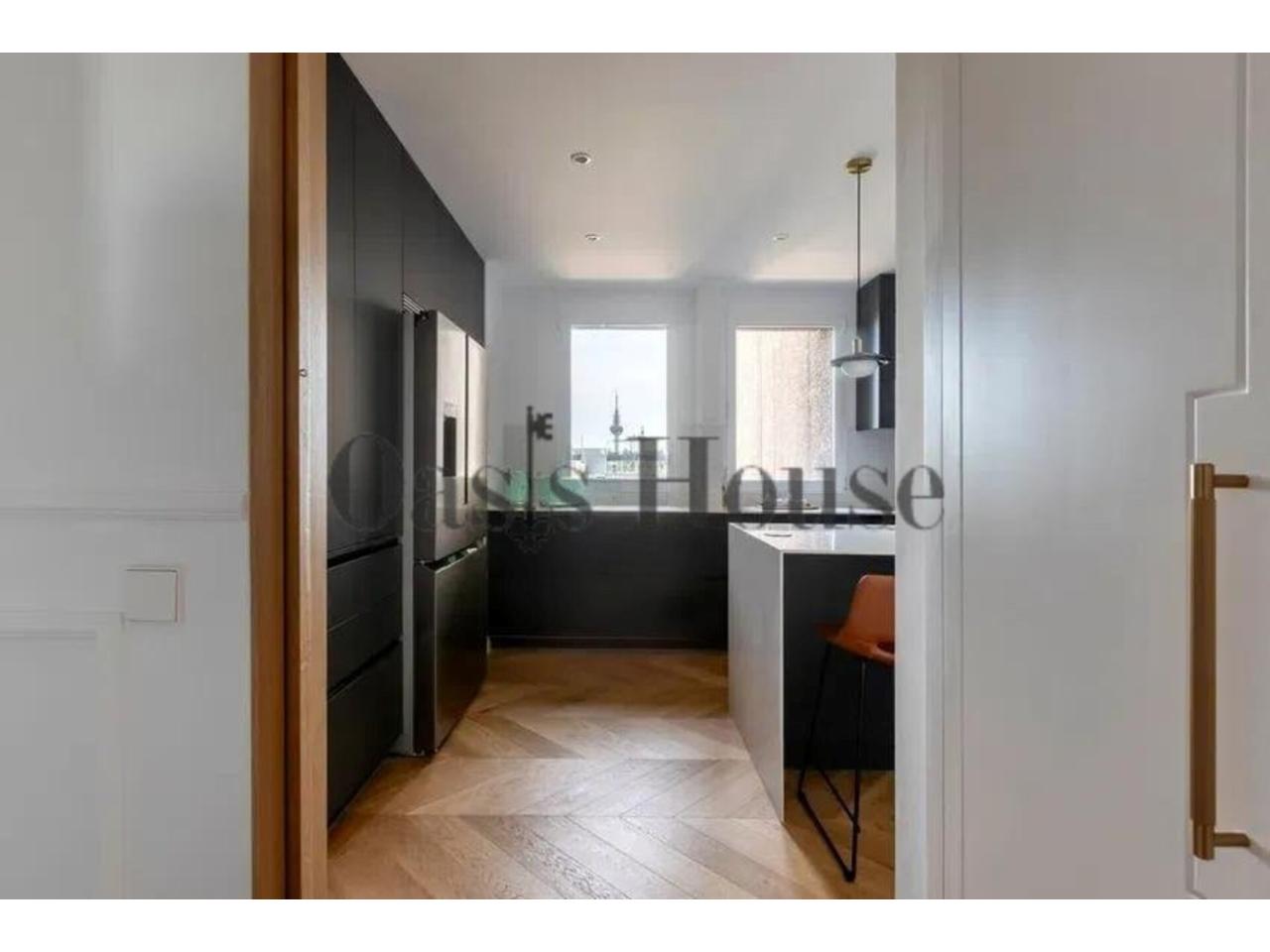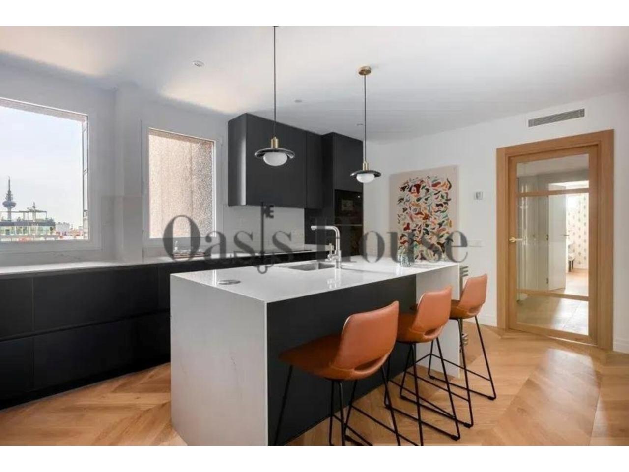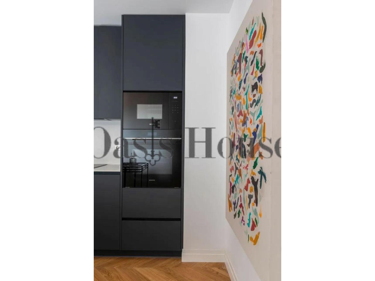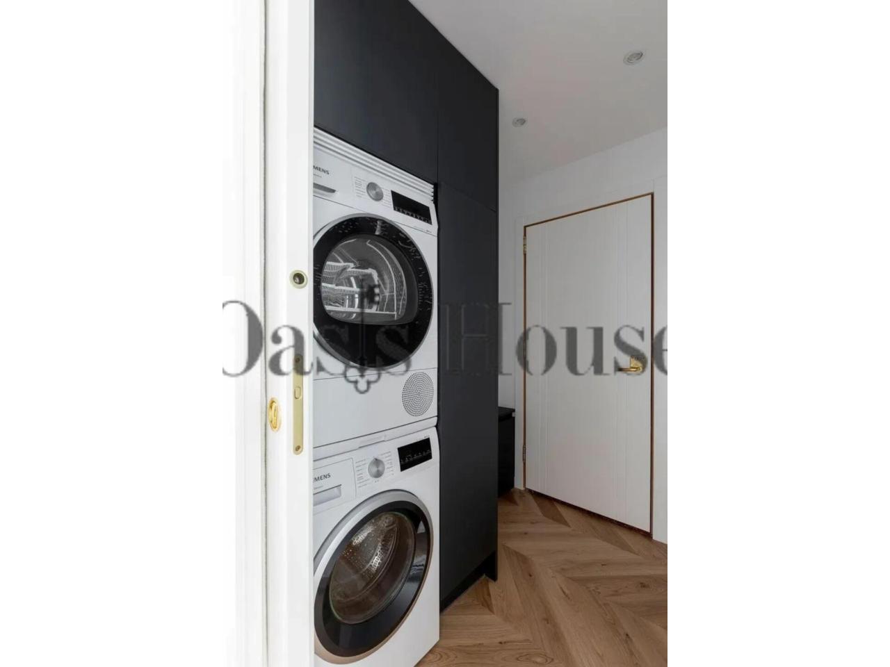 La cocina, independiente y bañada por luz natural gracias a sus dos grandes ventanales, se articula en torno a una elegante isla central. Está equipada con electrodomésticos Siemens, nevera americana y una funcional zona de lavandería independiente, integrando diseño, tecnología y practicidad.